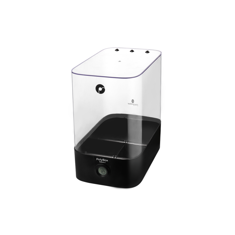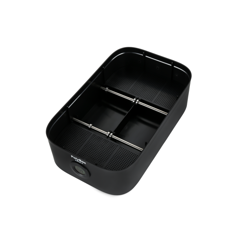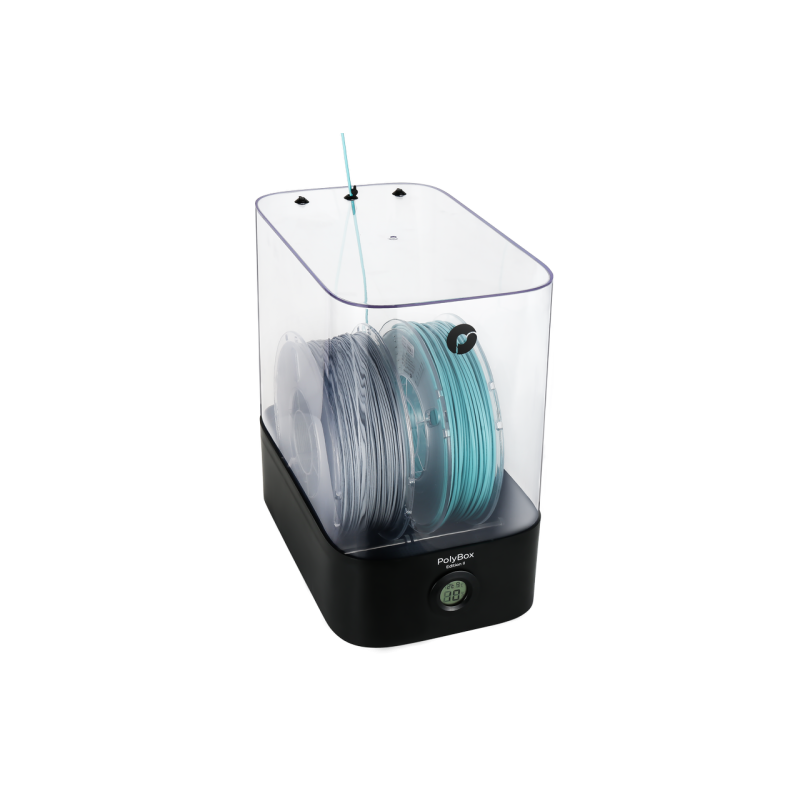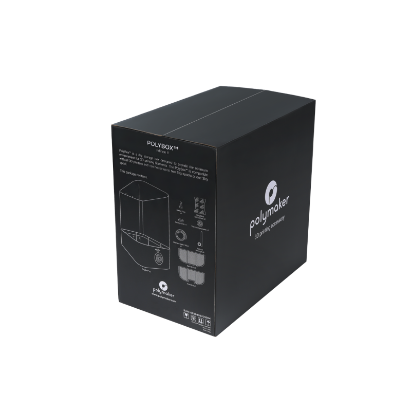 Păstrați șirurile de imprimare într-un mediu optim, astfel încât să puteți imprima de pe ele în orice moment. Expunerea la mediul înconjurător, în special la praf sau umiditate, duce la degradarea multor materiale de imprimare. Acestea își pierd apoi proprietățile mecanice și facilitează imprimarea. Unitatea de depozitare PolyBox va păstra materialul într-un mediu optim, care va fi informat de un termometru și un higrometru precis. Este inclus un dispozitiv de absorbție a excesului de umiditate, care va fi deosebit de util pentru materialele PolySmooth, PVA sau Nylon foarte absorbante.